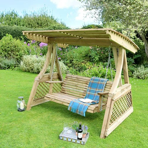 The elegant Santorini Swing has been designed with comfort in mind with an ergonmic seat generously wide enough for two. The swing is built with bowed laminated supports giving not only a beautifully enhanced look, but this also allows for an uninterrupted panoramic view of the garden, which is not possible with many swings.